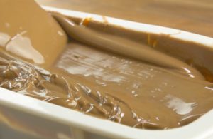 Take the mixture off the heat and stir in the bicarbonate of soda. Quickly pour this into the chocolate silicone tray and chill until set.