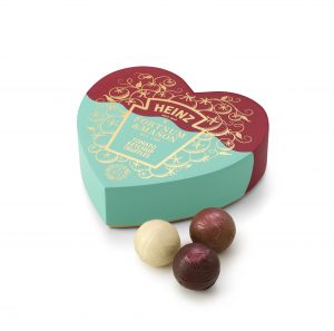 Presented in a heart-shaped box and made by hand, you and your loved one can enjoy nine milk, white and dark chocolate truffles filled with a blonde chocolate ganache and Heinz Tomato Ketchup.