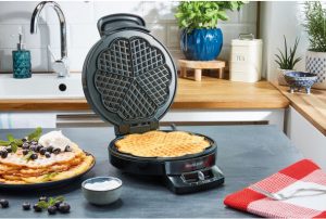 It can make up to five heart-shaped waffles at once, meaning you can make waffles to your heart’s content.