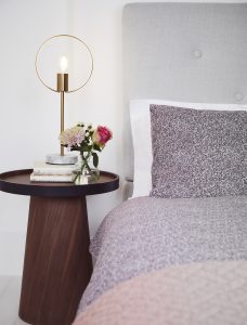 Pretty ditsy florals and art deco fan prints in shades of pink and purple appear on bedding, while marble effects add a touch of luxe to bathroom accessories.