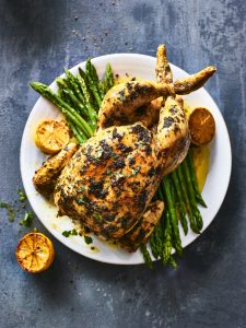 Feast on the Spring Herb Chicken, a juicy butter-basted whole chicken with a mixed herb, lemon and garlic butter under the skin, finished with a sprinkle of fresh herbs.