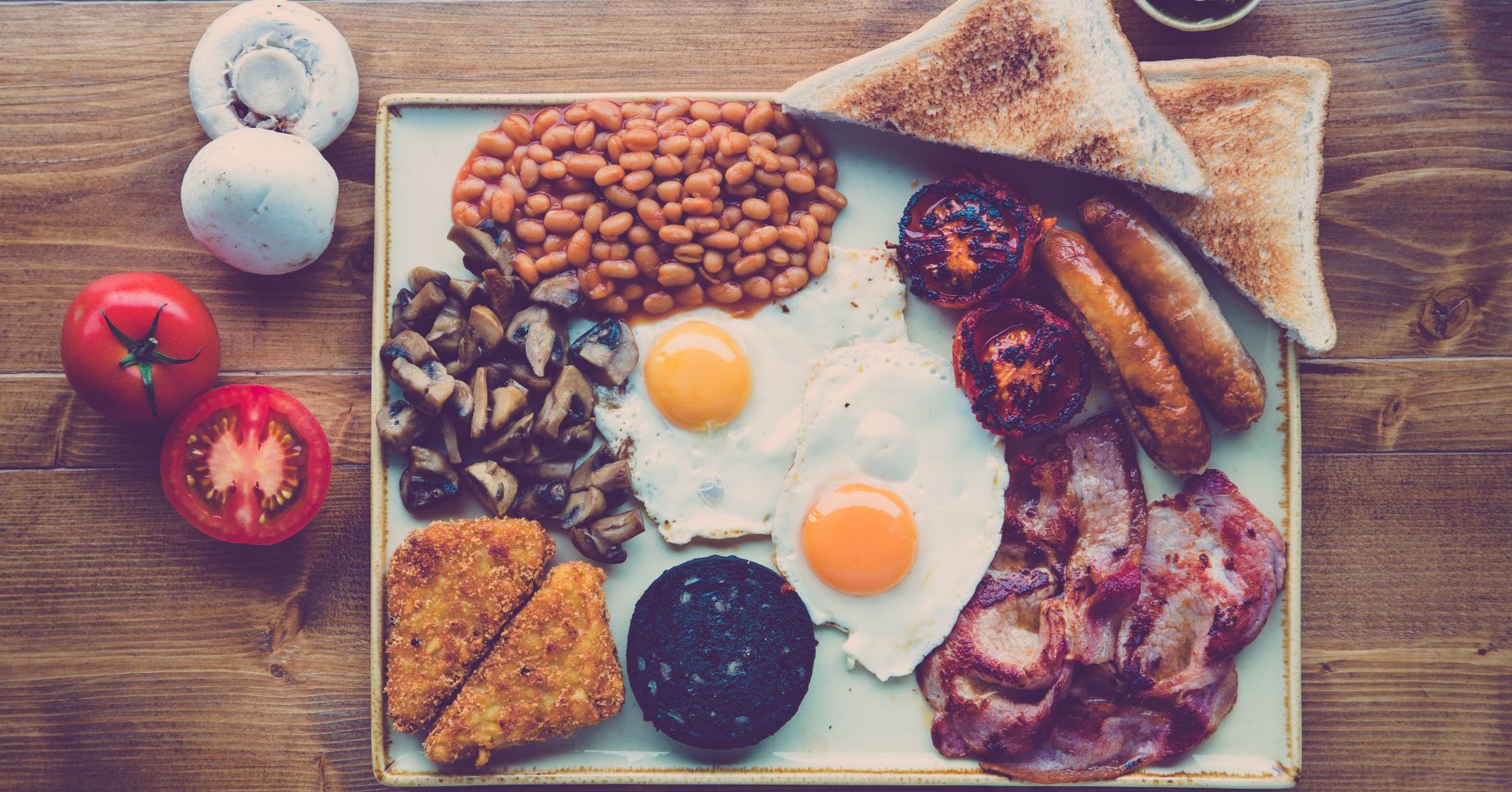 According to the English Breakfast Society, a full English consists of back bacon, eggs, British sausage, baked beans, fried tomato, fried mushrooms, black pudding and fried and toasted bread.