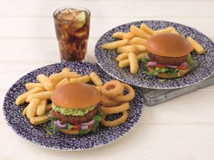 The vegan burger features a patty from Meatless Farm, chopped Cos lettuce, tomato and red onion in a vegan sourdough bun.