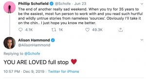 Alison, 44, took to Twitter to support Phil amid reports that he had created a ‘toxic’ atmosphere on the This Morning set.