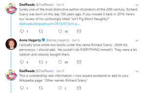 It came after one user tweeted about Richard Scarry, on what would have been the US author’s 100th birthday, hailing him as one of the 20th-century’s “most distinctive author-illustrators”.