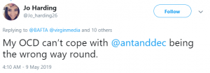 Someone else joked: “My OCD can’t cope with @antanddec being the wrong way round.”