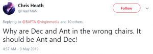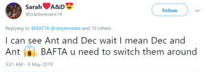 Another wrote: “I can see Ant and Dec, wait I mean Dec and Ant. BAFTA you need to switch them around.”