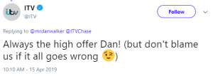Commenting on the clip on Twitter, ITV’s official account insisted he should go for the high offer, adding with a wink emoji: “But don’t blame us if it all goes wrong.”