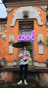 The picture sees the aspiring photographer holding a parasol while sporting a patterned shirt and a camera around his neck.