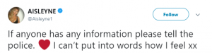 On Twitter she wrote: “If anyone has any information please tell the police. I can’t put into words how I feel xx.”