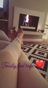 Sharing a picture of her with her feet up by a roaring fire, she wrote: “Finally feel safe.”