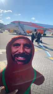 Kate’s pals made sure her hen party got off to a flying start as they arrived at the airport with the bride-to-be dressed in an oversized white shirt emblazoned with the words “Mrs Ferdy To Be” on the back.