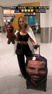 She was also dragging a case printed with her husband-to-be’s face and carrying a doll dressed in a Borat-style green mankini and wearing a mask of Rio’s face.