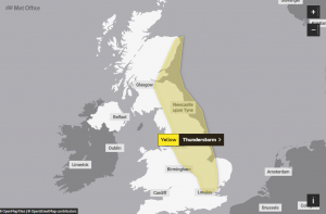 The Met Office placed the warning across almost the entire eastern side of the country from Scotland to London.