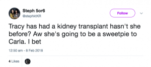 “Tracy and carla, be besties, with ur kidney problems pls x” said one fan, while another agreed adding: “Tracy has had a kidney transplant before hasn’t she? Aw she’s going to be a sweetpie to Carla. I bet.”