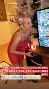 The image showed Caroline wearing a red night dress with her hair tied up, and trying to get her television to work, with Mollie captioning the image: “Our funny valentine bought us cookies and oat milk this year.”