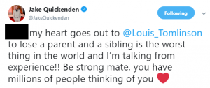 Jake Quickenden tweeted: “My heart goes out to @Louis_Tomlinson to lose a parent and a sibling is the worst thing in the world and I’m talking from experience!!