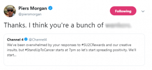 The tweet read: “One hour left to ask for your #SU2CRewards. Thanks to everyone who’s joined in and donated (and our very good sport @PiersMorgan!).