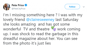 Claire, who last year lost four stone, also retweeted a post from another friend, which said: “I’m missing something here? I was with my lovely friend @clairesweeney last Saturday she looks amazing.”