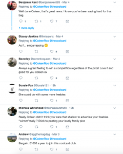 One follower replied to her post: “Really Coleen didn’t think you were that shallow to advertise your freebies ‘winner’ really ? Stick to posting your lovely family pics.”
