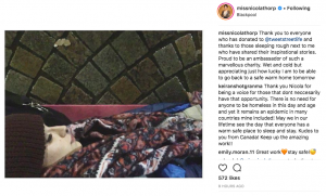 She wrote: “Thank you to everyone who has donated,” she wrote. “And thanks to those sleeping rough next to me who have shared their inspirational stories.”