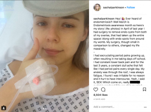 One in ten women suffer from endometriosis and, last week, Sacha posted a picture of herself in a hospital bed, for endometriosis awareness month in March.