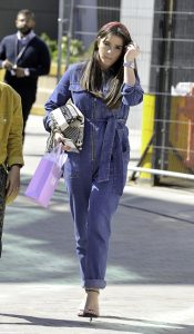 Completing the look was a matching denim belt and red hair band over her dark hair.