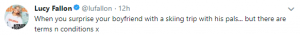 The Coronation Street actress, best known for playing Bethany Platt, took to Twitter to share her fiendish plot, writing: “When you surprise your boyfriend with a skiing trip with his pals… but there are terms n conditions x.”