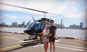 Her boyfriend Tom also shared a cute photo to his Instagram, showing the couple posing in front of a helicopter as they prepared to fly around the city.