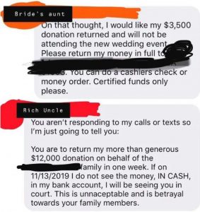 Since the post, guests have demanded that their donations be refunded and have said that they won’t be attending the rescheduled wedding.