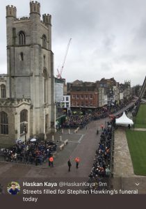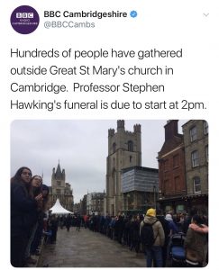 Five hundred guests are expected to attend the funeral of Stephen Hawking in Cambridge today, with thousands of admirers and locals lining the streets to watch his cortege pass by.