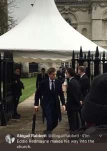 Hollywood star Eddie Redmayne, who played Hawking in the 2014 film The Theory of Everything, will give a reading at the service, and was earlier spotted by Twitter user Abigail Rabbett (@abigailRabbett) making his way into the church.