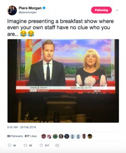 Next to a screengrab showing the wrong names during a technical fault, Piers wrote: “Imagine presenting a breakfast show where even your own staff have no clue who you are. 😂😂.”