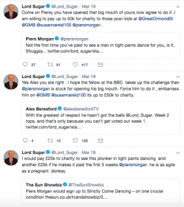 Lord Alan Sugar then got involved, tweeting Piers – who he often spars with online – “I would pay £25K to charity to see this plonker in tight pants dancing and another £25K if he makes it past the first 5 weeks.
