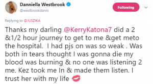 Danniella said: “Thanks my darling, @KerryKatona7 did a 2 & 1/2 hour journey to get to me & get me to the hospital. I had pjs on was so weak (sic).”