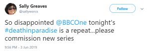 One wrote: “So disappointed @BBCOne tonight’s #deathinparadise is a repeat… please commission new series.”