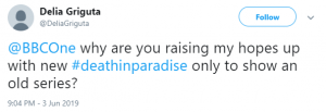 Another said: “@BBCOne why are you raising my hopes up with new #deathinparadise only to show an old series?”
