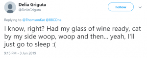 Someone else wrote back: “I know, right? Had my glass of wine ready, cat by my side woop, woop and then… yeah, I’ll just go to sleep.”