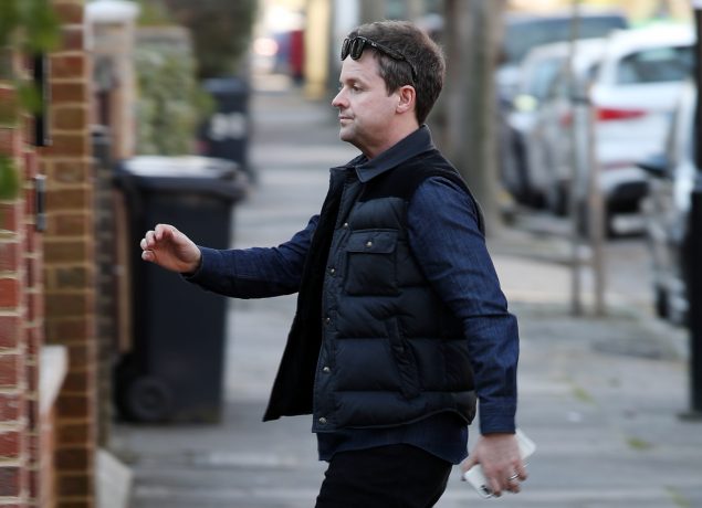 Declan Donnelly has been photographed smiling while waiting at the front door of his best friend Ant McPartlin’s home this afternoon.