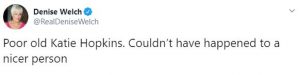 On Twitter, Denise responded to a Mirror article about the sale and wrote: “Poor old Katie Hopkins. Couldn’t have happened to a nicer person.”