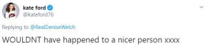 Actress Kate Ford, who plays Corrie’s Tracy Barlow, was among those to respond to the tweet, siding with Denise as she corrected her: “‘Wouldn’t’ have happened to a nicer person xxxx.”