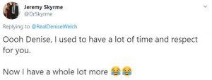 One of Denise’s followers replied: “Oooh Denise, I used to have a lot of time and respect for you. Now I have a whole lot more.”