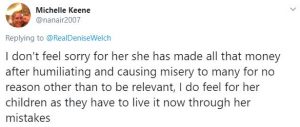 Another said: “I don’t feel sorry for her she has made all that money after humiliating and causing misery to many for no reason other than to be relevant, I do feel for her children as they have to live it now through her mistakes.”