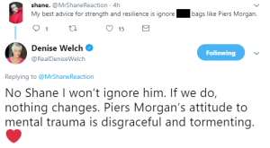 Denise said: “No, I won’t ignore him. If we do, nothing changes. Piers Morgan’s attitude to mental trauma is disgraceful and tormenting.”