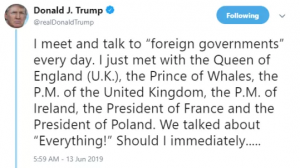 He tweeted: “I meet and talk to ‘foreign governments’ every day. I just met with the Queen of England (U.K.), the Prince of Whales, the P.M. of the United Kingdom, the P.M. of Ireland, the President of France and the President of Poland.”