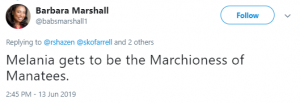 A third tweeted: “Melania gets to be the Marchioness of Manatees.”