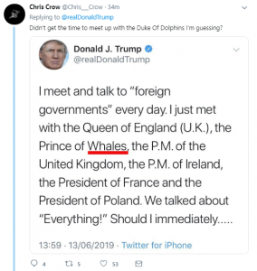 The controversial US President called the next in line to the throne the “Prince of Whales” on Twitter – and an avalanche of jokes rolled in from his huge follower base.
