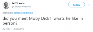 A fifth asked: “Did you meet Moby Dick? What’s he like in person?”