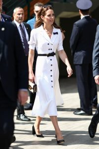 Kate wore a white midi dress by Suzannah which had black detail at the buttons and a black Alexander McQueen belt across her waist paired with black pumps and a pair of sunglasses.