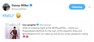 Lucy captioned her tweet: “What an amazing night at the @OfficialNTAs … thank you #raquelbalenciaofficial for the loan of this beautiful dress and @scottbeswick for my make up and all you lovely people for voting.”